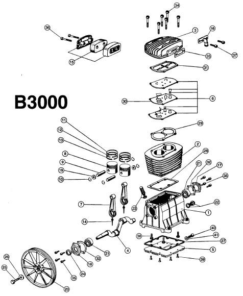 Complete B3800 replacement air compressor pump assembly includes flywheel, sight glass, oil breather, and air filter (no aftercooler). 3 - 5 HP.